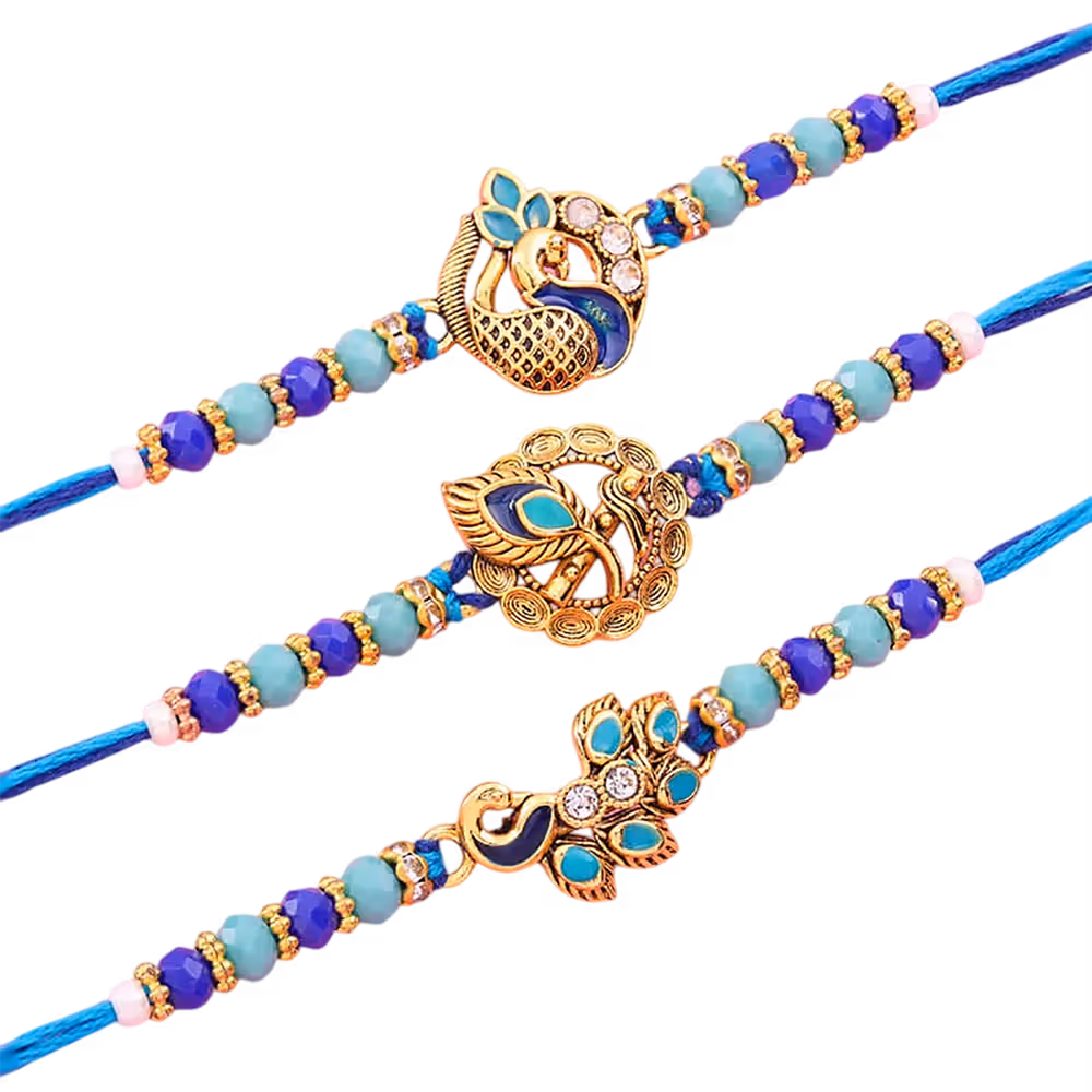 1 x Peacock Motif Rakhi, 1 x Beaded Thread, and 1 x Decorative Card