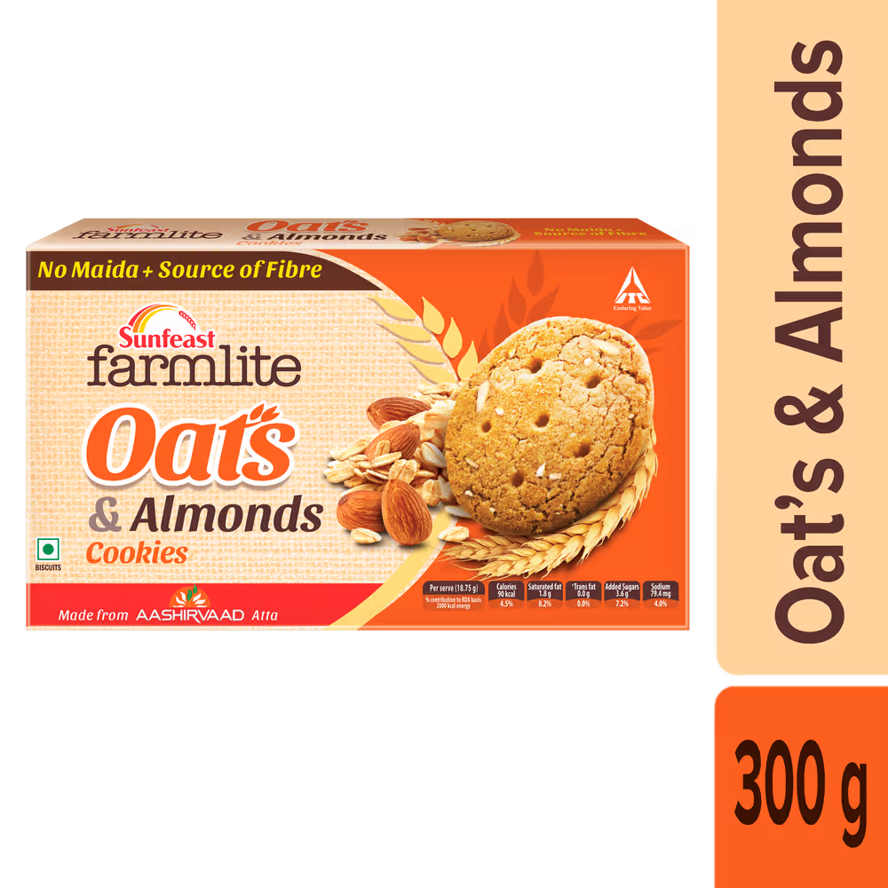Almond Bits (3.2%), Artificial Flavouring Substances (milk, Vanilla), Emulsifier (lecithin (from Soyabean)), Invert Syrup, Liquid Glucose, Lodized Salt, Maltodextrin, Milk Solids, Raising Agents [ins 450(i), ins 500(ii), ins 503(ii)], Refined Palm Oil, Refined Sugar, Rolled Oats (21.2%), Wheat Flour (Atta) (35.3%)