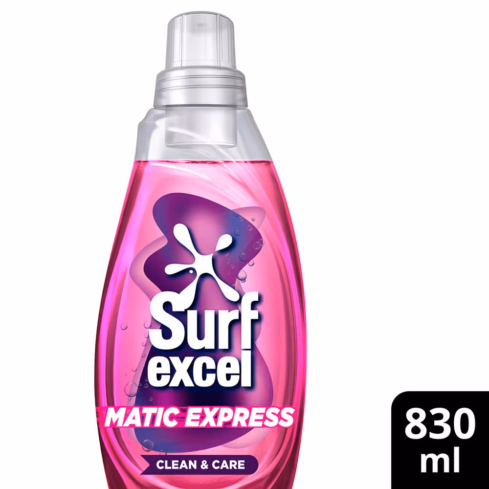 Surf Excel Matic Express Clean & Care liquid detergent provides express cleaning with 2X care action, removes malodor, and gives long-lasting freshness