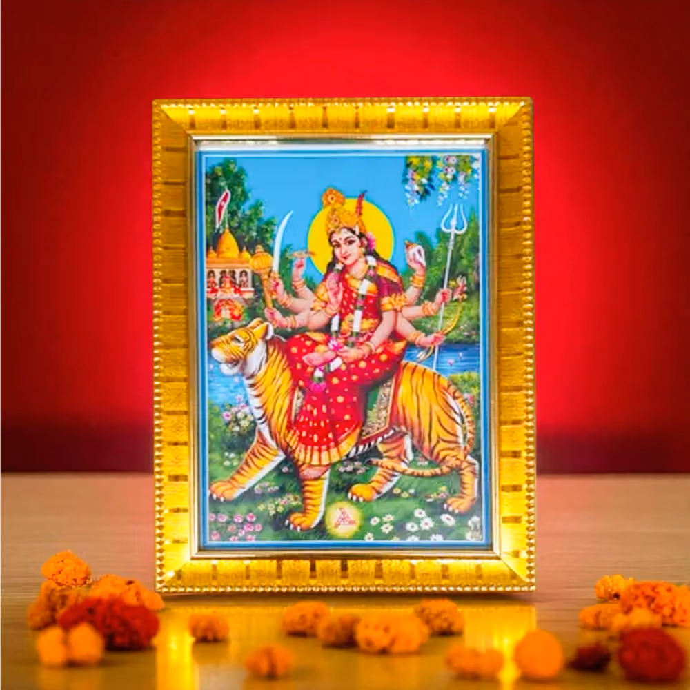 Vibrant multicolour design, perfect for pooja and worship, durable cardboard and paper, includes a sturdy frame
