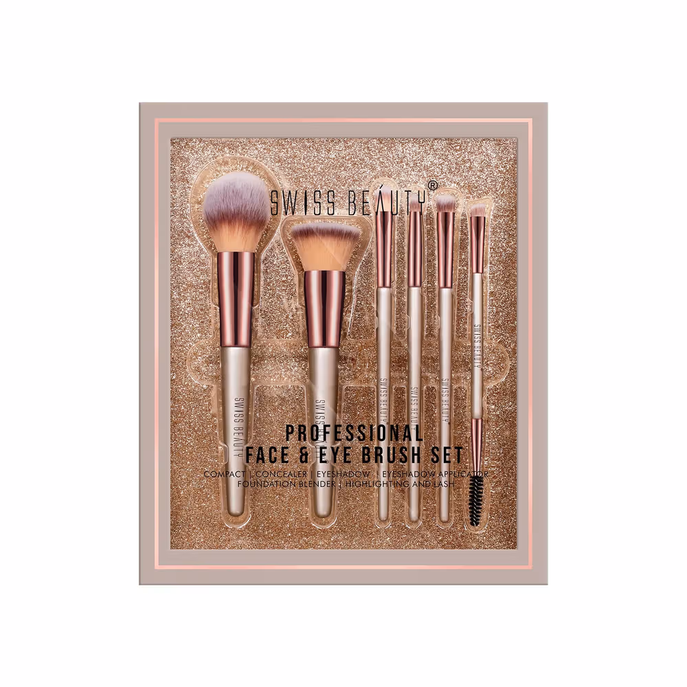 1 x Brow Brush, 1 x Concealer Brush, 1 x Eyeshadow Applicator Brush, 1 x Eyeshadow Brush, 1 x Foundation Blender Brush, and 1 x Powder Brush
