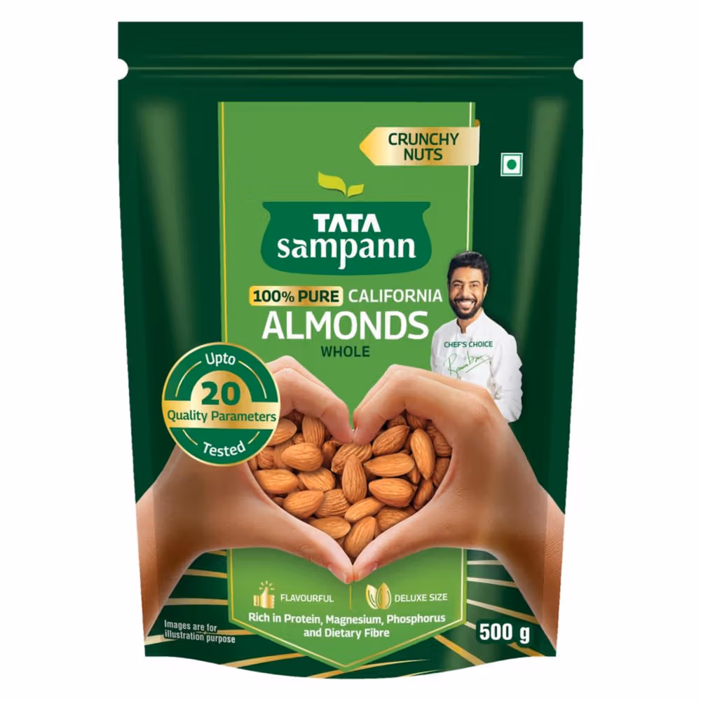 100% pure California almonds, choicest selection of nuts, rich in protein and fiber, premium multilayer packaging
