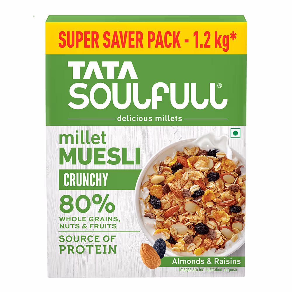 Almond (3%), Anticaking Agent (INS 170(I)), Antioxidant (INS 320), Corn Flakes (5%), Edible Vegetable Oil (Palmolein), Emulsifier (INS 322(I)), Honey (1.3%), Invert Sugar Syrup, Lodised Salt, Malt Extract, Millets (16%) [Jowar (6.3%), Ragi (9.7%)], Refined Sugar, Raisins (3%), Rolled Oats (35%), Whole Wheat Flakes (20%)
