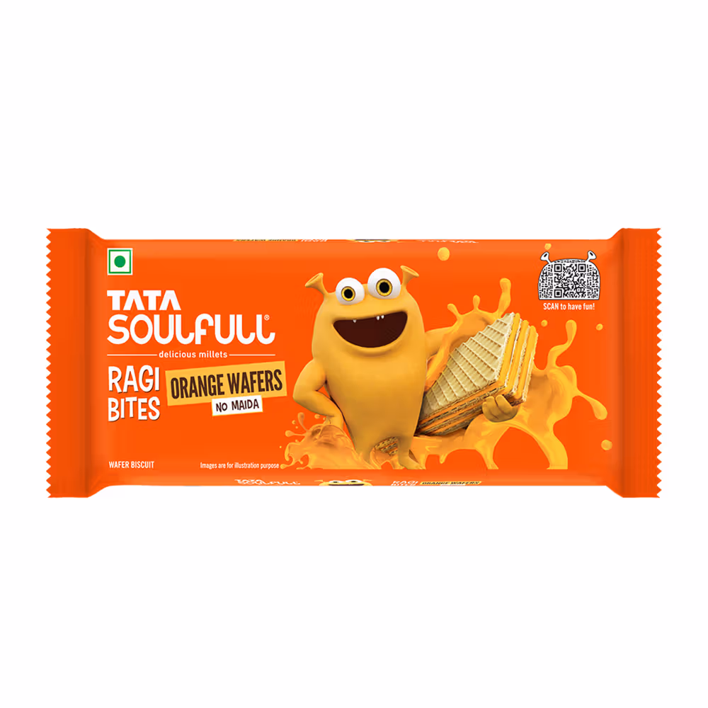 Indulge in the delicious crunch of Tata Soulfull ragi bites orange wafers made with wholesome ingredients and no maida. Enriched with 16% millets containing nutritious jowar and ragi, these wafers are a go-to convenient snack for any occasion. Crafted with a delightful orange flavor to satisfy your cravings, perfect for kids and adults alike. Ideal for on-the-go munching, school tiffin, or as a light evening snack -made for all age groups. No maida and made with cereal flours, these wafers are thoughtfully prepared to bring you a wholesome snacking experience