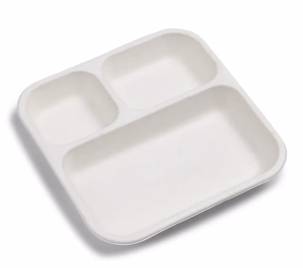 Features three compartments for organized serving, made from sustainable bagasse material, making it ideal for parties and events