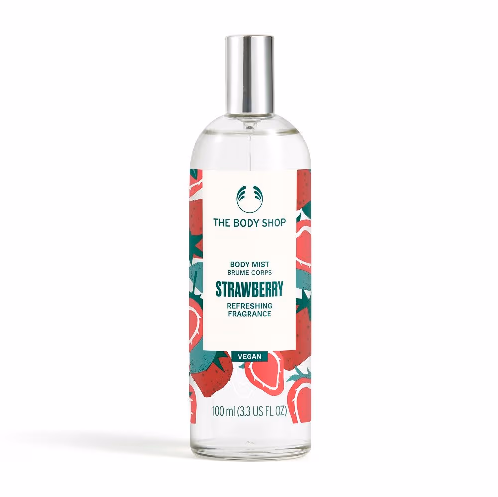 Refreshing strawberry-scented body mist, made with 97% natural origin ingredients, recyclable glass packaging with 31% recycled content