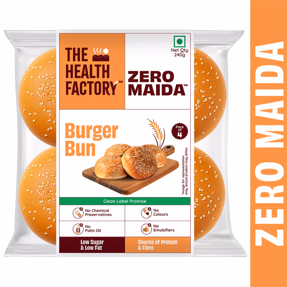 These Health Factory Zero Maida Burger Buns are made with 100% whole wheat, high in fiber and protein, and free from preservatives, emulsifiers, and palm oil