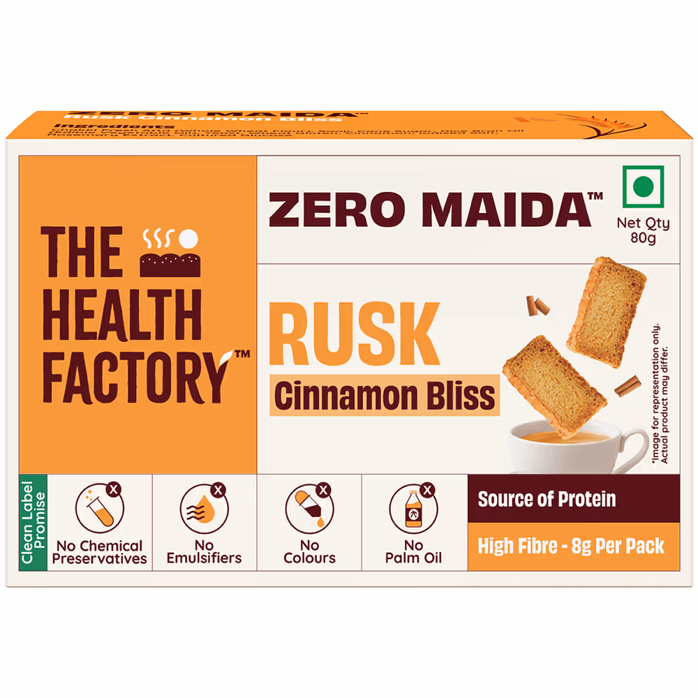 The health factory zero maida rusk with cinnamon offers a healthy and delicious tea-time snack with a warm cinnamon flavor and 8 grams of fiber
