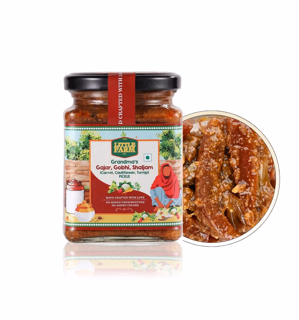 Gobhi, Shalgum, Carrots, Red chilli, Himalayan pink salt, Garam masala, Rai, Jaggery, Sugarcane vinegar, Cold pressed mustard oil, Ginger, Garlic, Citric Acid