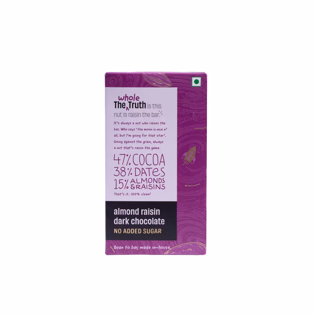 Cocoa - 47% (Cocoa Nibs - 38%, Cocoa butter - 9%), Dates - 38%, Roasted Almonds - 9%, Golden raisins - 6%