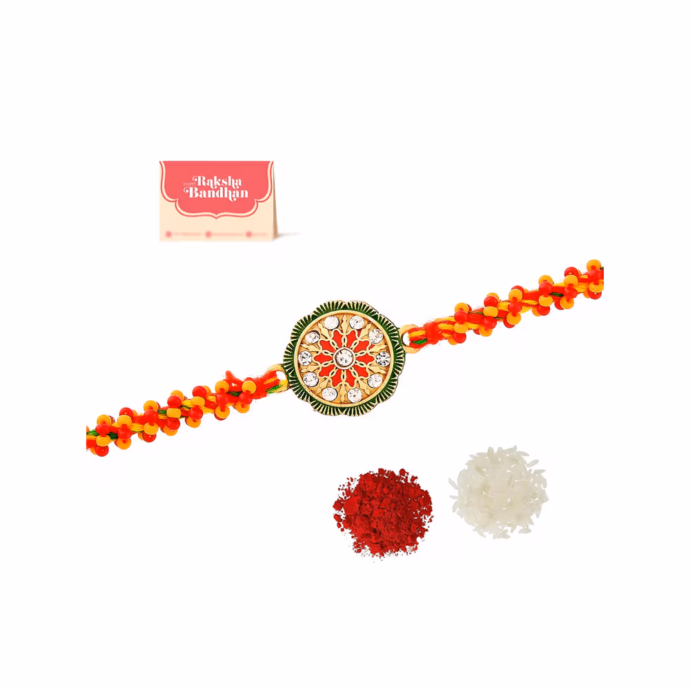 Traditional motifs with orange enamel, comfortable all-day wear design, includes roli and chawal pack, perfect for raksha bandhan celebration