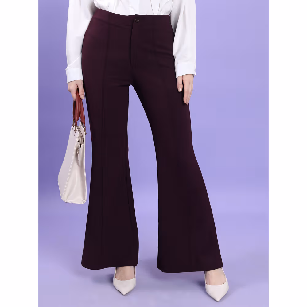Flattering high-rise waistband design, premium polyester blend fabric comfort, versatile bootcut silhouette style