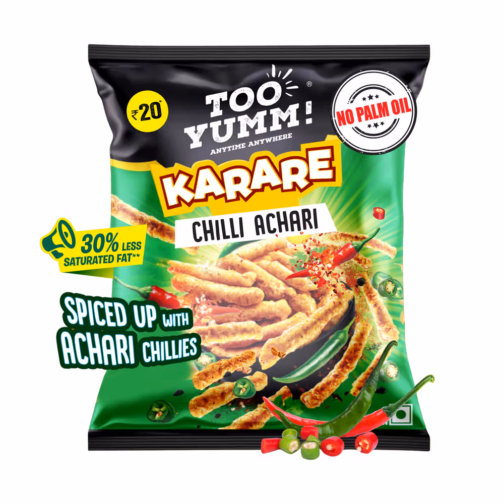 A tangy and spicy chilli achari flavor, perfect for parties, made with rice and corn offering a crispy texture in every bite, 60% less saturated fat for a healthier snacking choice, no palm oil, made with 100% rice bran oil for a cleaner snack, a vegetarian snack with a bold and irresistible taste
