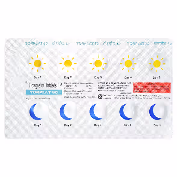 An antiplatelet medicine that helps prevent blood clots in people with heart disease. It reduces the risk of heart attack, stroke, or blockage by ensuring smooth blood flow in the arteries. It can be taken with or without food. Some patients may experience shortness of breath or bleeding.