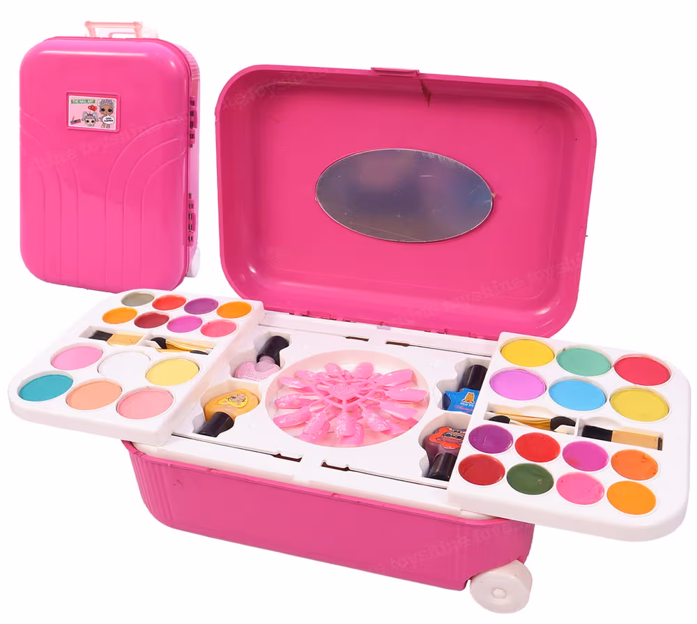 Complete cosmetic set with trolley design, Non-toxic and water washable formula, multiple makeup colors and accessories, convenient storage for toys and makeup
