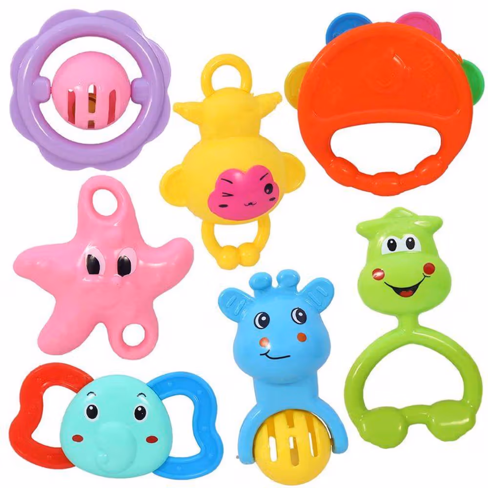 1 x Big Ball with Soft Mesh, 1 x Big Dumbbell with Soft Mesh, 1 x Blue Bear, 1 x Butterfly, 1 x Dafli, 1 x Green Bear, and 1 x Teether Ring with Fruit Leaves