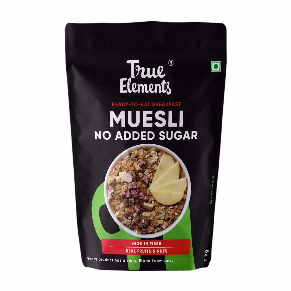True Elements No Added Sugar Muesli is a nourishing, great-tasting breakfast cereal made with five nutritious grains: wheat, corn, rice, barley, and oats, along with almonds and raisins
