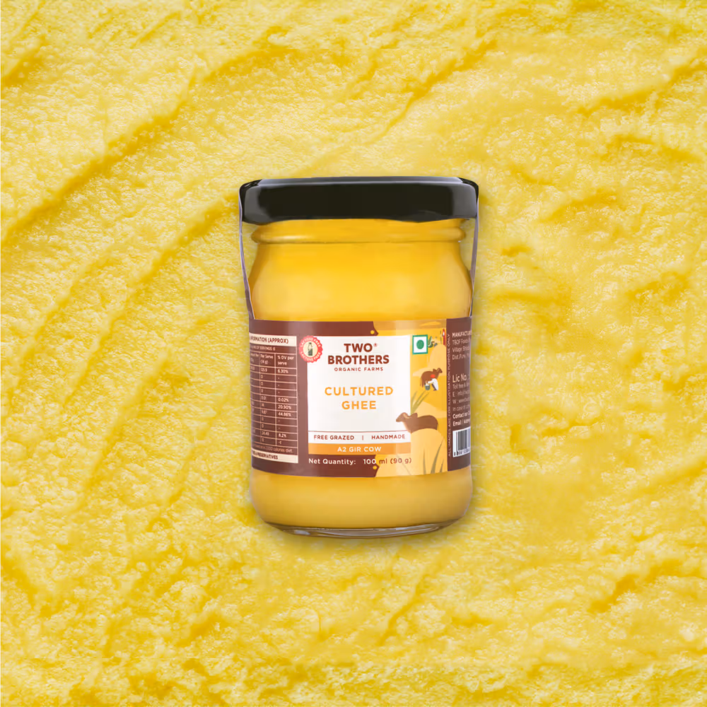 Handmade using traditional Bilona method, free-grazed A2 Gir cow milk, no additives or preservatives, melts below body temperature
