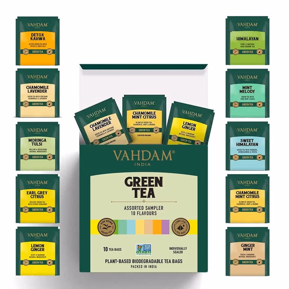 USDA certified organic green tea blends, Plant-based biodegradable pyramid bags, Variety of 10 unique wellness flavors