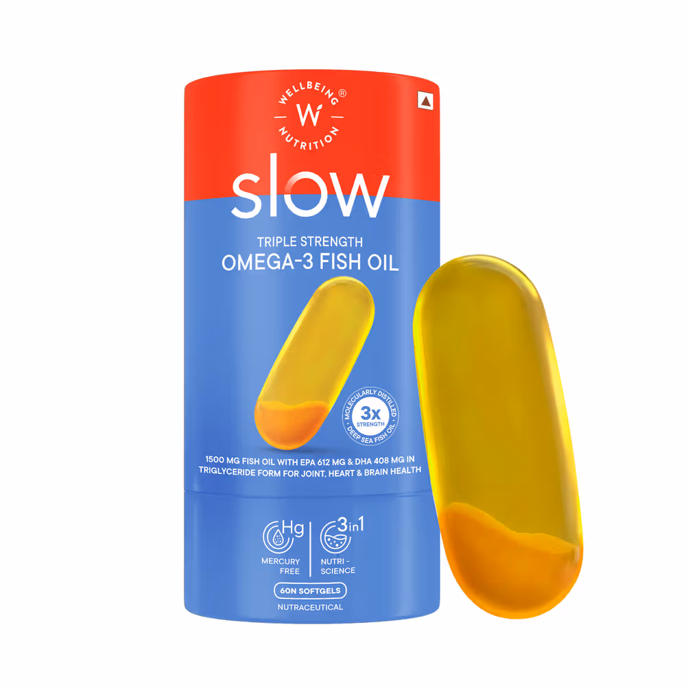 Triple strength omega-3, supports brain, joint and heart health, contains curcumin extract, slow release technology, high purity omega-3, free from gluten, lactose, preservatives, artificial flavors, and fillers