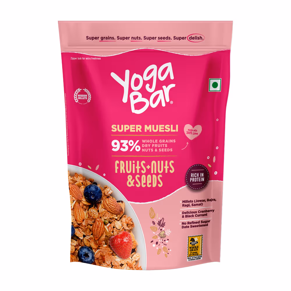 Whole Grains 50% (Rolled Oats, Brown Rice Flakes), Dried Fruit 22% (Raisins, Cranberries, Apricots, Blackcurrants), Seeds 18% (Quinoa, Pumpkin, Chia, Flax), Almonds, Soy Protein Flakes, Rice Bran Oil, Jaggery, Himalayan Pink Salt