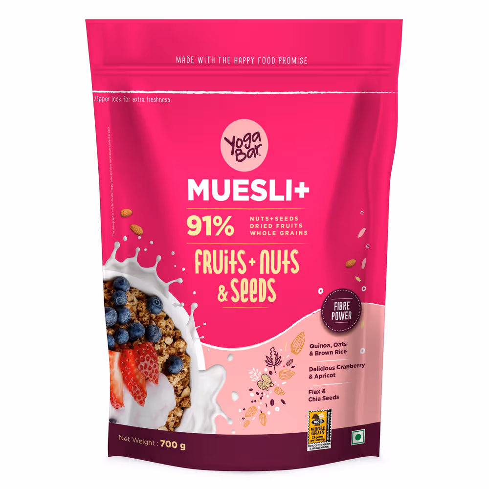 Whole Grains 50% (Rolled oats, Brown rice flakes), Dried Fruit 22% (Raisins, Cranberries, Apricots, Blackcurrants), Seeds 18% (Quinoa, Pumpkin, Chia, Flax), Almonds, Soy protein flakes, Jaggery, Rice bran oil, Himalayan Pink Salt