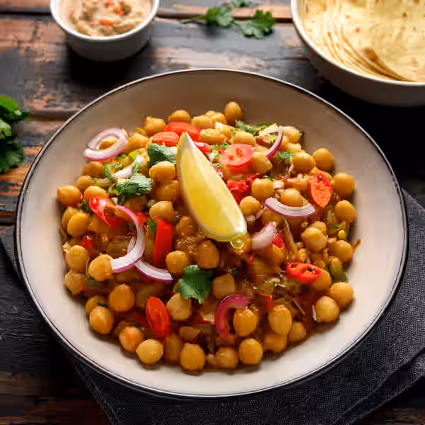 Chana Chaat is a tangy and spicy North Indian street food made from chickpeas mixed with onions, tomatoes, and spices, often enjoyed as a snack.