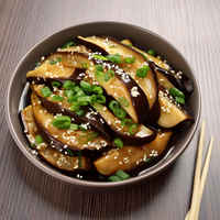 A savory and slightly spicy dish featuring stir-fried eggplants seasoned with garlic, ginger, and soy sauce, commonly found in Chinese cuisine.