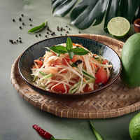 A crisp and refreshing Thai salad, Green Papaya Salad, also known as Som Tum, combines shredded green papaya with a tangy, spicy dressing and a mix of other vibrant ingredients like carrots and tomatoes. It's a perfect dish to enjoy on a warm day.