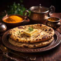 Naan is a soft and pillowy Indian flatbread traditionally baked in a tandoor, or clay oven. It is typically served hot and brushed with ghee or butter.