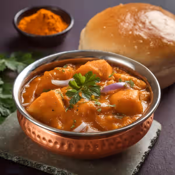 Pav Bhaji is a spicy blend of mashed vegetables in tomato gravy served with buttered bread rolls, a popular street food from Mumbai, India.