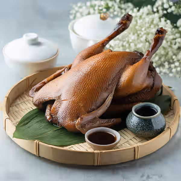 Peking Duck is a famous duck dish from Beijing, known for its crispy skin and aromatic meat, typically served with pancakes, sweet bean sauce, and fresh scallions.