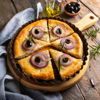 Pissaladière is a traditional dish from the south of France, resembling a pizza, topped with caramelized onions, olives, and anchovies, perfect as an appetizer or a light meal.
