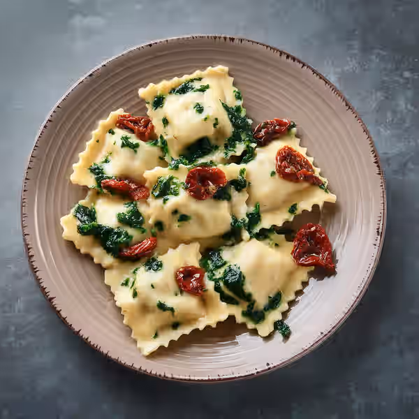 Fresh homemade ravioli filled with a creamy cheese blend, cooked to perfection and served with a rich tomato sauce.