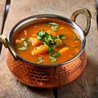 Sambar is a flavorful South Indian lentil stew made with a variety of vegetables, spices, and tamarind juice, often accompanied by rice or idli.