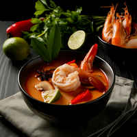 Tom Yum Soup is a classic spicy and sour Thai soup traditionally flavored with fragrant spices and herbs abundant in Thailand. This version of the popular soup includes mushrooms and shrimp, making it a flavorful and hearty dish perfect for any meal.